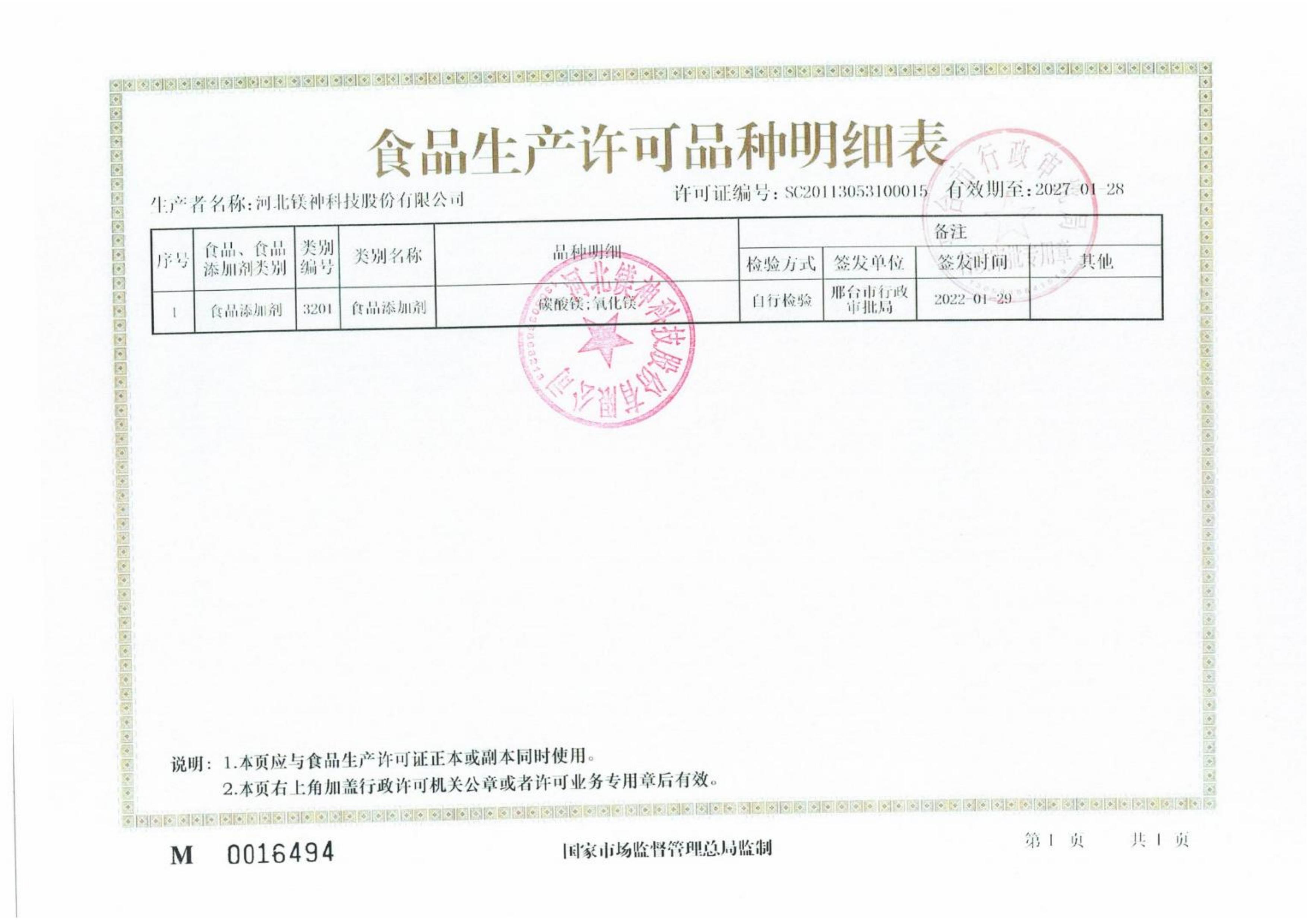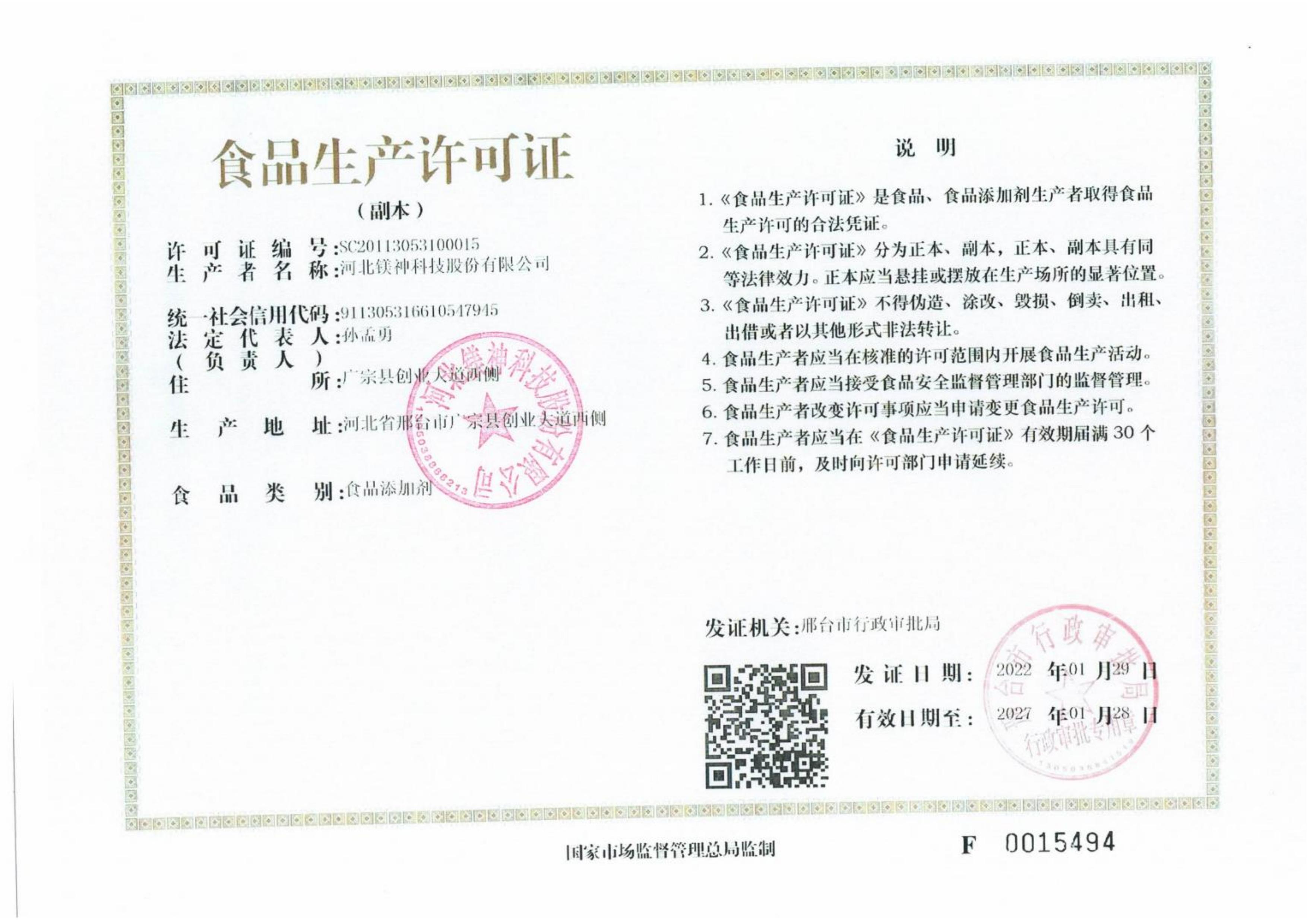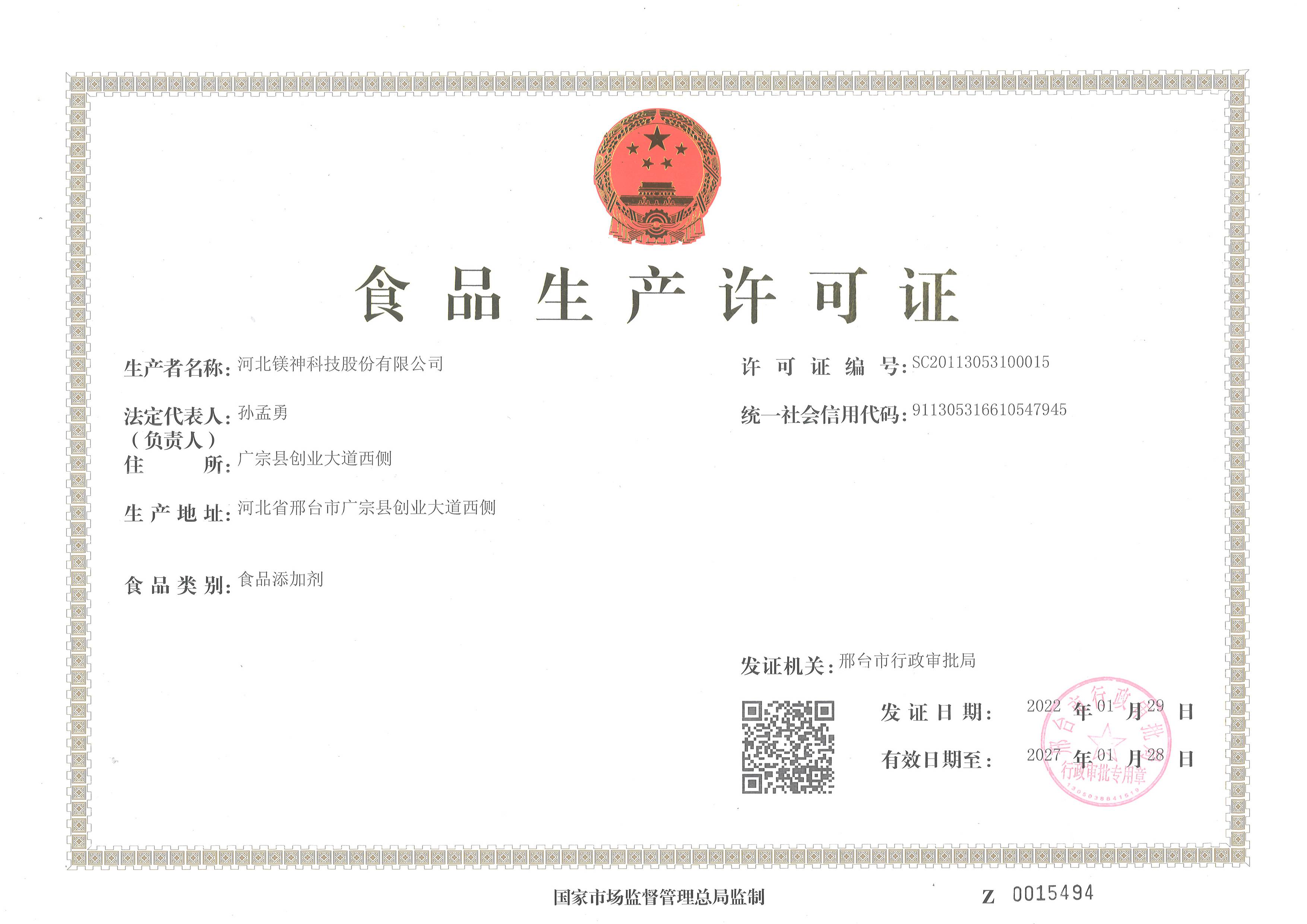 冶金鎂業食品生產許可證正本