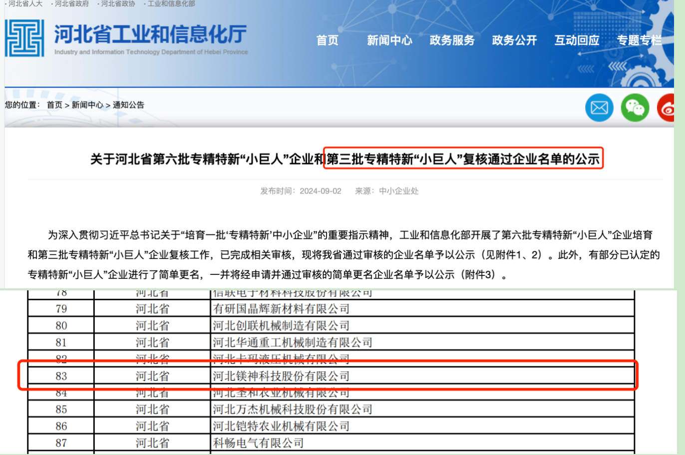 河北鎂神科技股份有限公司近日喜訊連連,成功通過了國家級“專精特新小巨人”企業的復審。 據悉,此次復審由工業和信息化部組織專家進行,在復審過..熱線電話