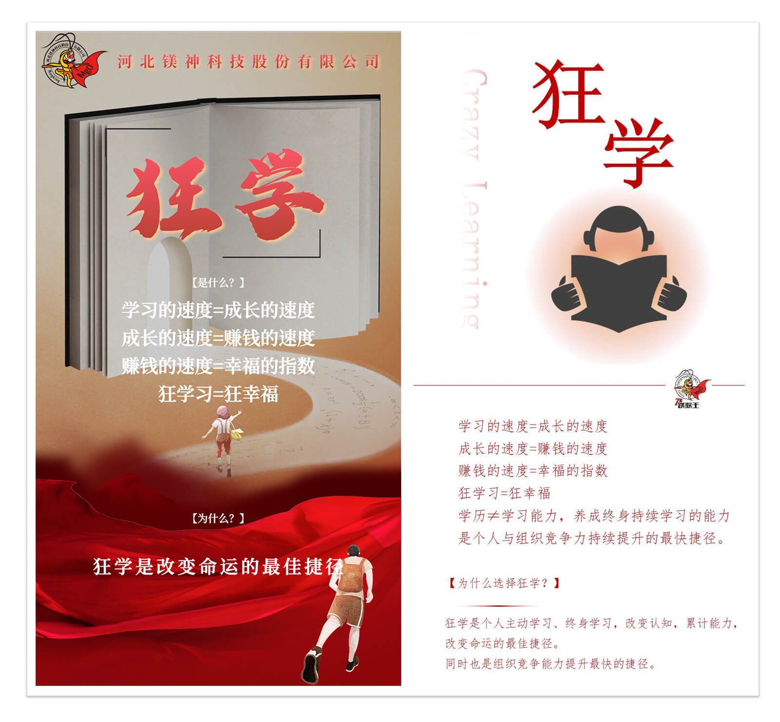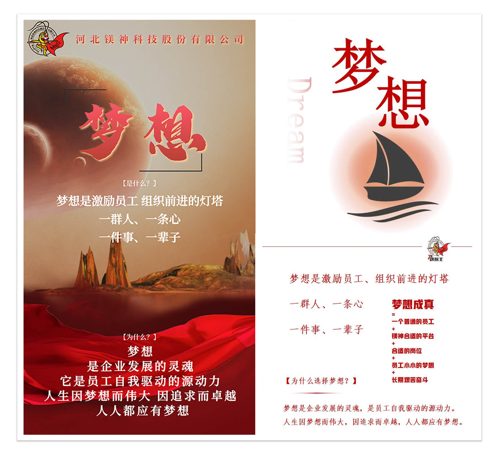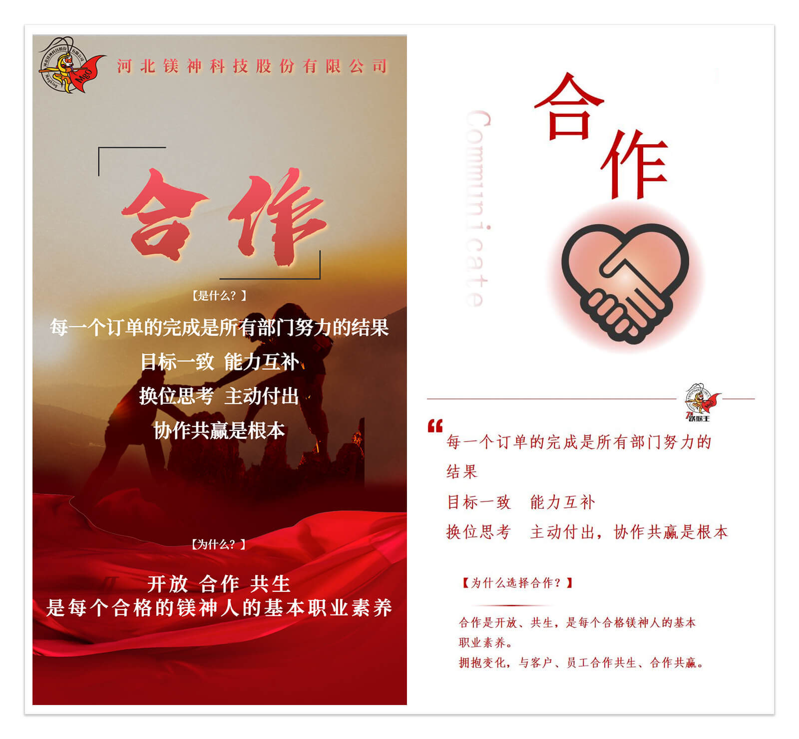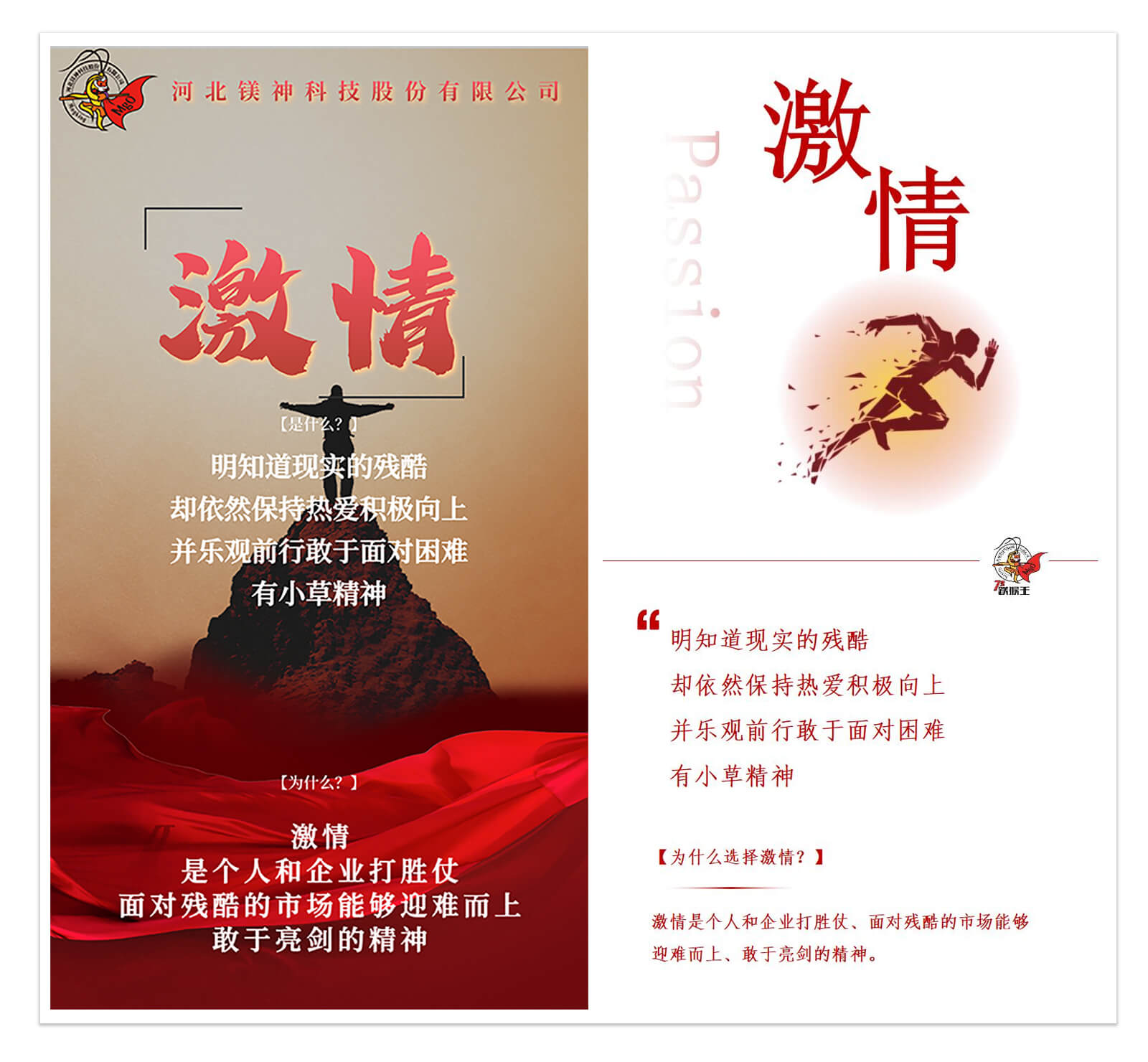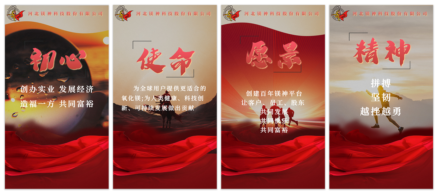 鎂神科技以創(chuàng)辦實(shí)業(yè),發(fā)展經(jīng)濟(jì),造福一方,共同富裕為初心;秉承著為全球用戶提供更適合的氧化鎂,為人類健康、科技創(chuàng)新、可持續(xù)發(fā)展作出貢獻(xiàn)的使命;有著創(chuàng)建百年鎂神平臺(tái),讓客戶、員工、股東共同發(fā)展、共同快樂、共同富裕的美好愿景;培育出拼搏、堅(jiān)韌、越挫越勇的鎂神人。鎂神人用誠信、激情、夢(mèng)想、狂學(xué)、內(nèi)省、溝通、合作、創(chuàng)新、利他的價(jià)值觀向客戶、社會(huì)各界朋友詮釋著鎂神的企業(yè)文化!